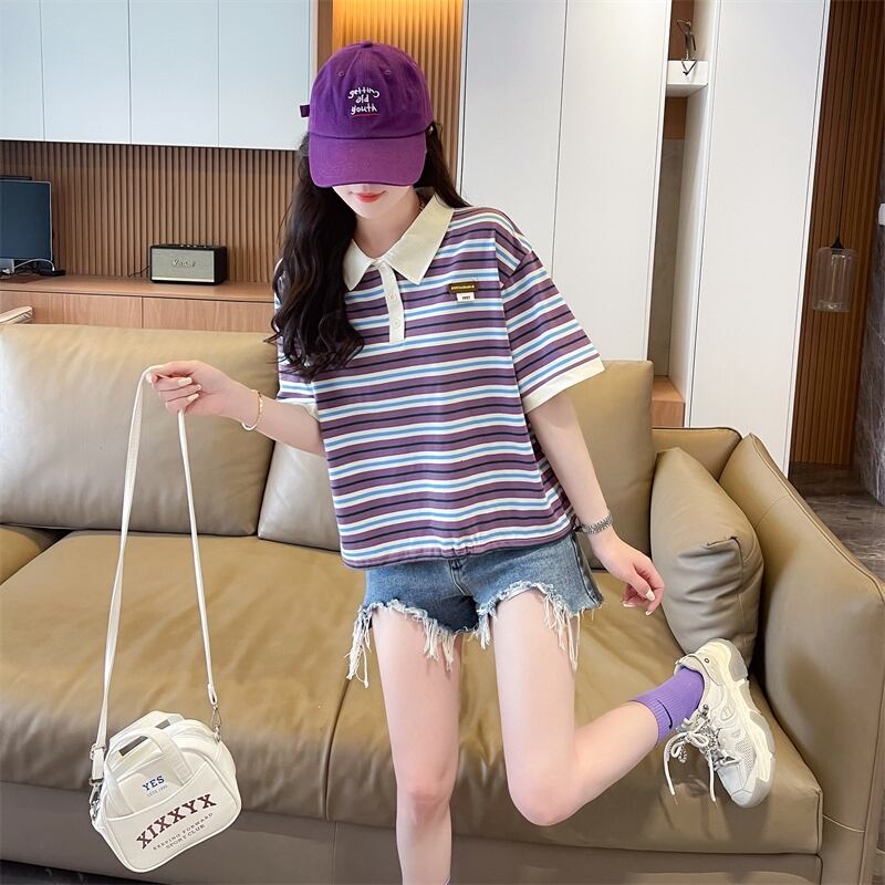 韓国風 着痩せ 半袖 ストライプ 襟ポロカラー Tシャツ